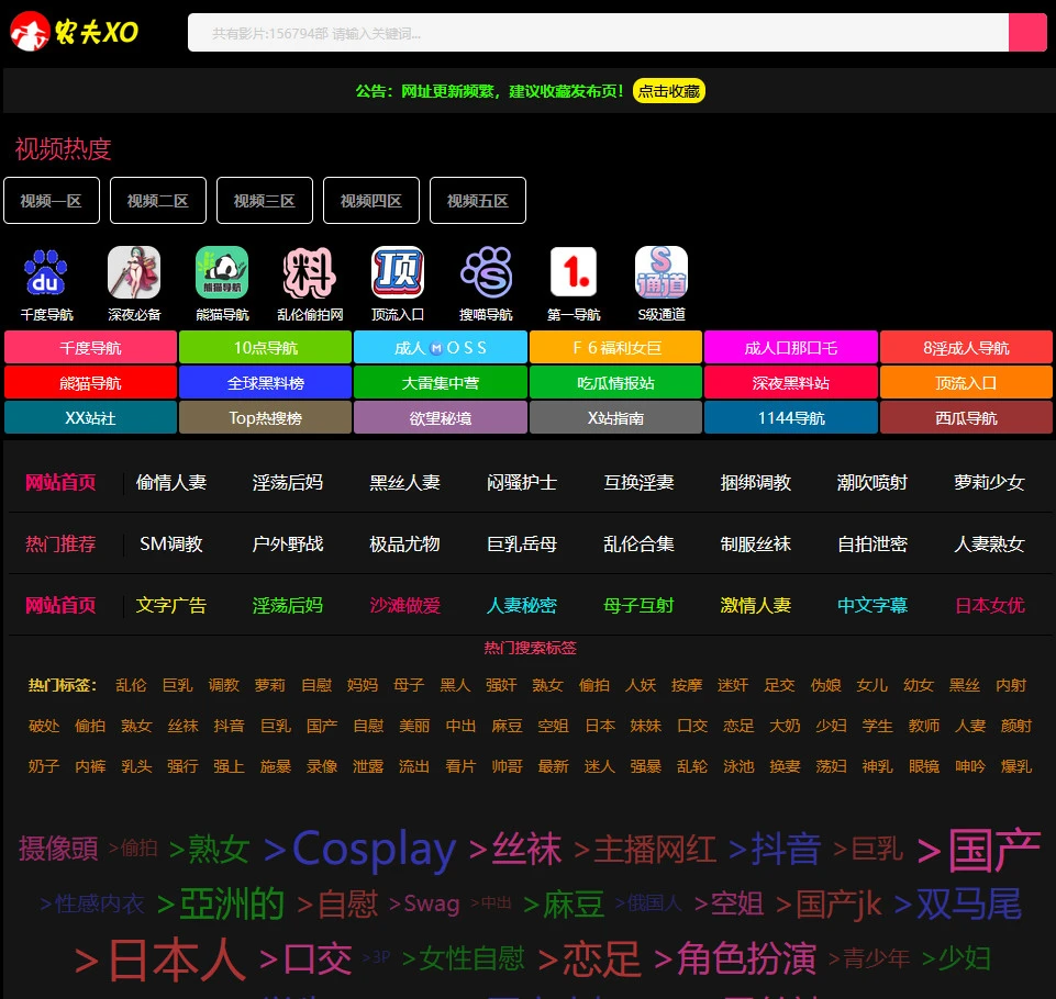 该网站是一款以成人视频聚合为核心的综合资源站,主打“多元化+分类清晰+导航便捷”。首页布局包含热门标签云、分类入口、视频专题、站点推荐和友情链接,几乎覆盖了所有常见的题材和资源类型。其内容不仅包括国产片、日韩影片、欧美资源,还延伸至Cosplay、主播私拍、SM调教、伦理剧情等小众分类,满足用户的多样化观看需求。